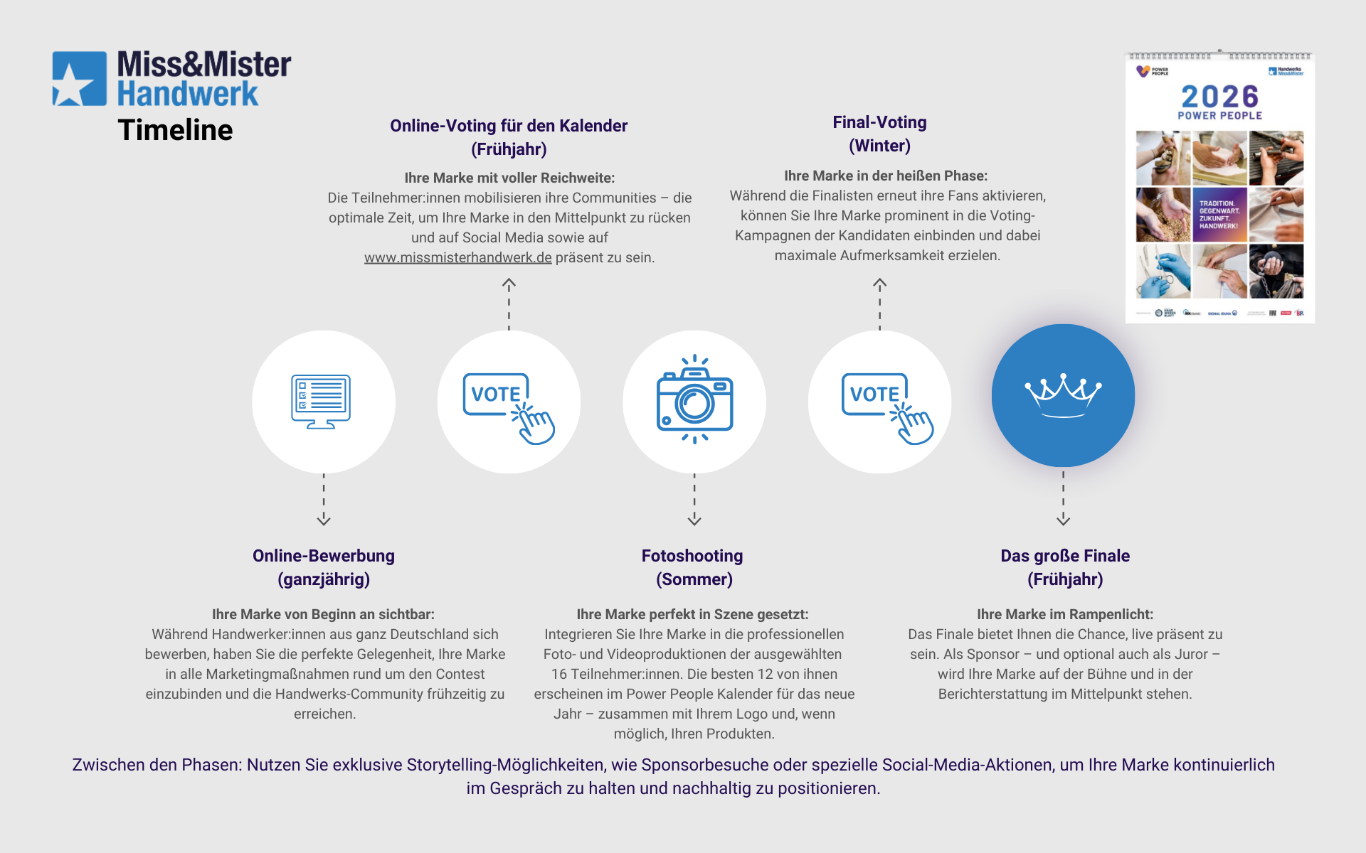 Seit über 15 Jahren bietet die Casting-Aktion Handwerks | Miss & Mister starken Persönlichkeiten aus dem Handwerk eine Plattform. Sie erzählt ihre Geschichten und gewährt der Community exklusive Einblicke hinter die Kulissen. Ob Elektroniker, Tischler oder Friseur – sie alle teilen die Leidenschaft für ihren Beruf. Nutzen Sie diesen Wettbewerb, um Ihre Marke gezielt und eindrucksvoll bei einer begeisterten Zielgruppe zu platzieren.